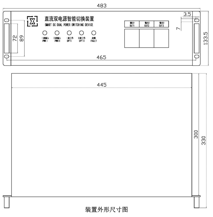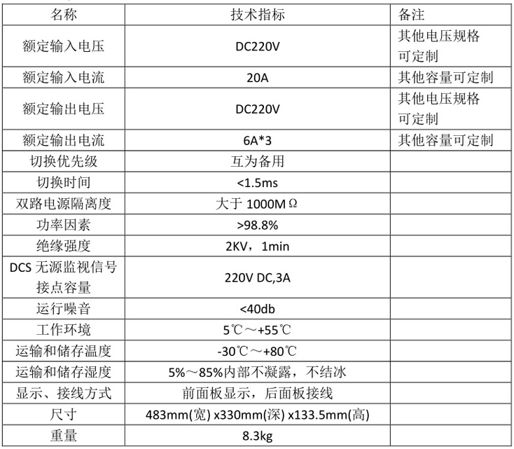 1、SDPS‐6ADC/T 直流双电源智能切换装置外形尺寸:483mm(宽) x330mm(深) x133.5mm(高),嵌入式安装。